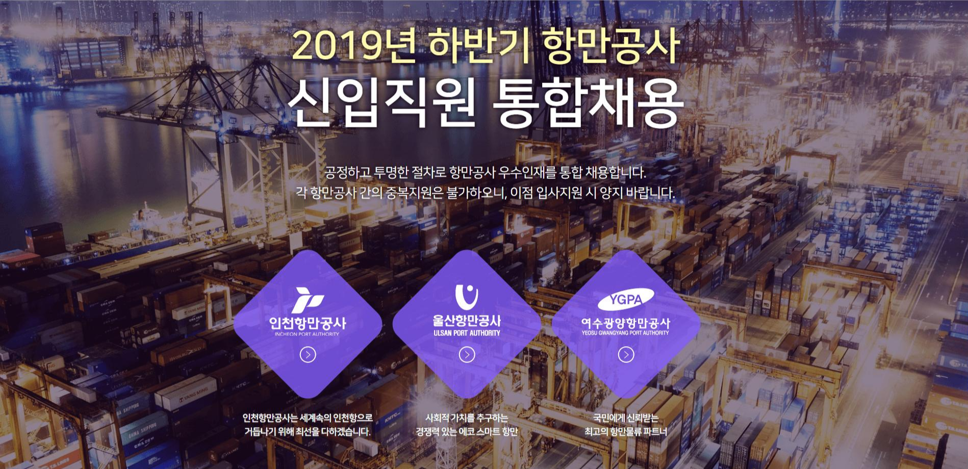 | 2019 하반기 항만공사 신입 통합 채용 - 인천항만공사 (0) | 2019.10.29 |